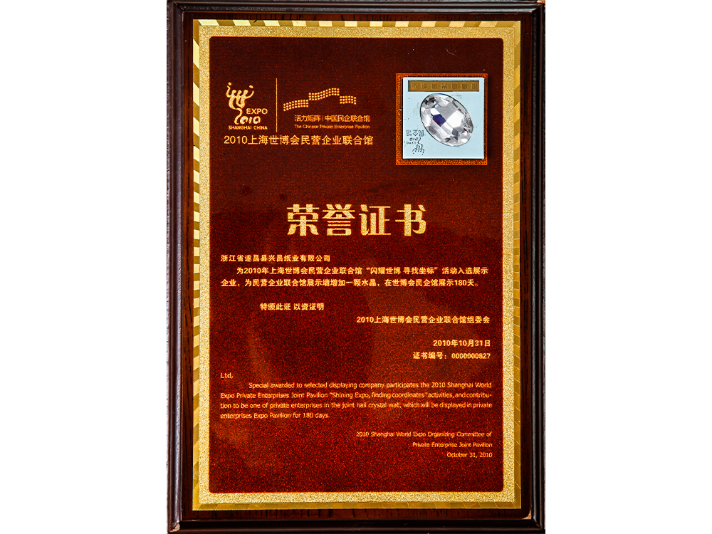 2010上海世博會民營企業(yè)聯(lián)合館榮譽證書